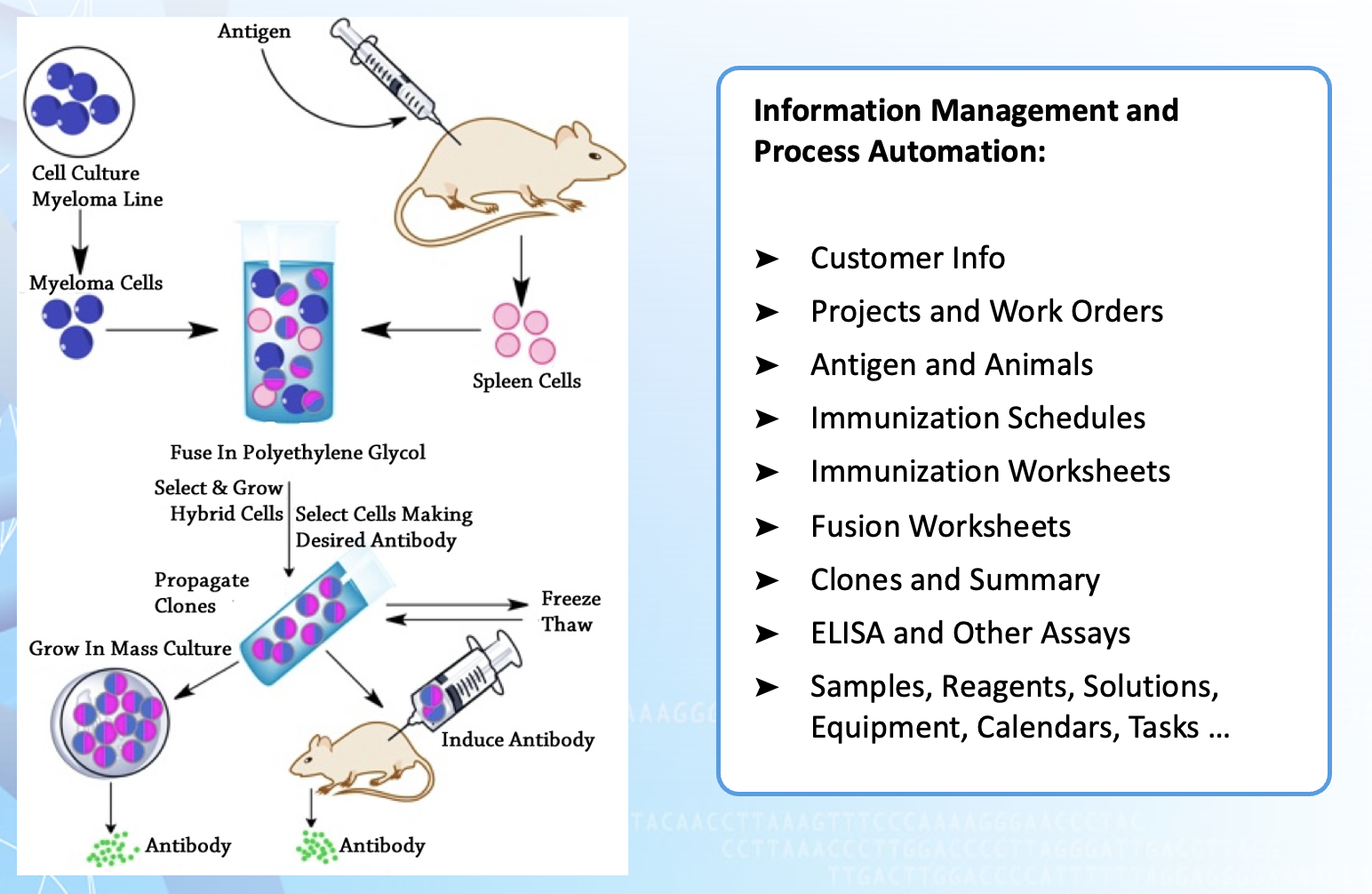 Producing monoclonal antibodies is one of biotechnology's most complex workflows. From initial antigen design through final quality validation, each step demands precise coordination of biological processes, meticulous documentation, and seamless integration of laboratory operations. A single antibody project can span months, involve multiple researchers, generate thousands of data points, and require tracking of hundreds of samples and reagents.